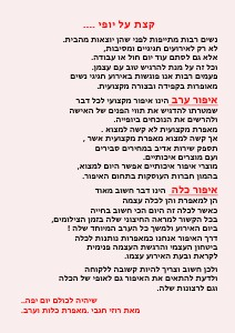 ‫קצת על יופי ....‬ ‫נשים רבות מתייפות לפני שהן יוצאות מהבית.‬ ‫לא רק לאירועים חגיגיים ומסיבות,‬ ‫אלא גם לסתם עוד יום חול או עבודה.‬ ‫וכל זה על מנת להרגיש טוב עם עצמן.‬ ‫פעמים רבות אנו פוגשות באירוע חגיגי נשים‬ ‫מאופרות בקפידה ובצורה מקצועית.‬ ‫איפור ערב הינו איפור מקצועי לכל דבר‬ ‫שמטרתו להדגיש את תווי הפנים של האישה‬ ‫ולהרשים את הנוכחים ביופייה.‬ ‫מאפרת מקצועית לא קשה למצוא .‬ ‫אך קשה למצוא מאפרת מקצועית אשר ,‬ ‫תספק שירות אדיב במחירים סבירים‬ ‫ועם מוצרים איכותיים.‬ ‫מוצרי איפור איכותיים אפשר היום למצוא,‬ ‫בהמון חברות העוסקות בתחום האיפור.‬ ‫איפור כלה הינו דבר חשוב מאוד‬ ‫הן למאפרת והן לכלה עצמה‬ ‫כאשר לכלה זה היום הכי חשוב בחייה‬ ‫בכל הקשור למראה החיצוני שלה בזמן הצילומים,‬ ‫ביום האירוע ולמשך כל הערב המיוחד שלה !‬ ‫דרך האיפור אנחנו כמאפרות נותנות לכלה‬ ‫ביטחון העצמי והרגשת העצמה פנימית‬ ‫לקראת ובעת האירוע עצמו.‬ ‫ולכן חשוב וצריך להיות קשובה ללקוחה‬ ‫ולדעת להתאים את האיפור גם לאופי של הכלה‬ ‫וגם לרצונות שלה.‬ ‫שיהיה לכולם יום יפה..‬ ‫מאת רוזי חגבי .מאפרת כלות וערב.‬