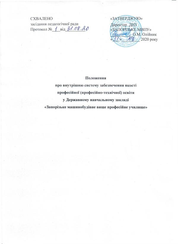 Положення про внутрішню систему забезпечення якості професійної ( професійно-технічної ) освіти у Державному навчальному закладі « Запорізьке машинобудівне вище професійне училище »