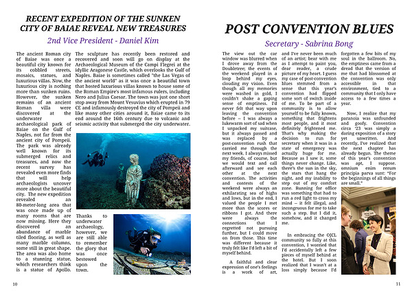 The view out the car window was blurred when I drove away from the Doubletree; the events of the weekend played in a loop behind my eyes, clouding my vision. Even though all my memories were washed in gold, I couldn’t shake a gaping sense of emptiness. I’d never felt that way upon leaving the convention before -- I was always a lukewarm sort of sad when I unpacked my suitcase, but it always passed and was replaced by a post-convention rush that carried me through the next week. I always missed my friends, of course, but we would text and call afterward and see each other at the next convention. The activities and contests of the weekend were always an exhilarating sea of highs and lows, but in the end, I valued the people I met more than the scores or ribbons I got. And there were always the connections that I regretted not pursuing further, but I could move on from those. This time was different because it truly felt like I’d left a bit of myself behind.