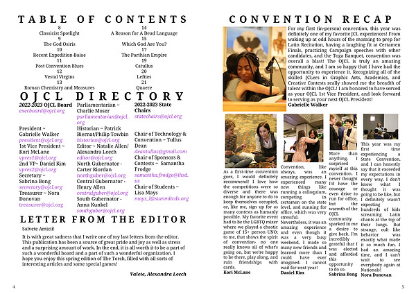 For my first (in-person) convention, this year was definitely one of my favorite JCL experiences! From waking up at odd hours of the morning to prep for Latin Recitation, having a laughing fit at Certamen Finals, practicing Campaign speeches with other candidates, and the Toga Banquet, convention was overall a blast! The OJCL is truly an amazing community, and I am so happy that I have had the opportunity to experience it. Recognizing all of the skilled JCLers in Graphic Arts, Academics, and Creative Contests really showed me the breadth of talent within the OJCL! I am honored to have served as your OJCL 1st Vice President, and look forward to serving as your next OJCL President!