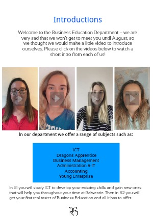 Welcome to the Business Education Department – we are very sad that we won’t get to meet you until August, so we thought we would make a little video to introduce ourselves. Please click on the videos below to watch a short intro from each of us!