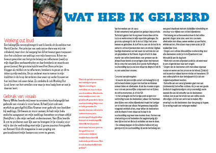 • Ik leerde dat persoonlijk contact ook belangrijk is bij online kennisdelen: je gaat niet met Jan en Alleman zomaar delen en uitwisselen. Ik zal dus moeten zorgen voor ook een persoonlijke component voor en tijdens de online momenten, al of niet f2f.
