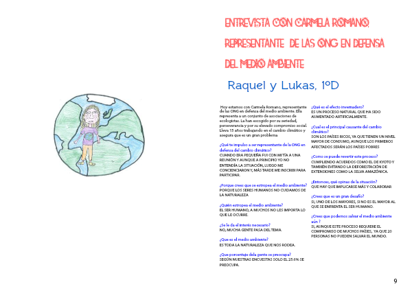 Hoy estamos con Carmela Romano, representante de las ONG en defensa del medio ambiente. Ella representa a un conjunto de asociaciones de ecologistas. La han escogido por su seriedad, perseverancia y por su elevado compromiso social. Lleva 15 años trabajando en el cambio climático y asegura que es un gran problema