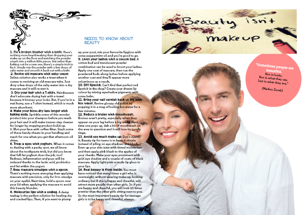 14. Real beauty is from inside: You must have noticed that many times a girl who is overweight, without wearing make-up, looking ordinary but if she is happy and cheerful, will attract more people than other girls. So if you are happy and cheerful, you will look 10 times prettier than the other girls sitting next to you. So the most important beauty tip for teenage girls is to be happy and cheerful, always.