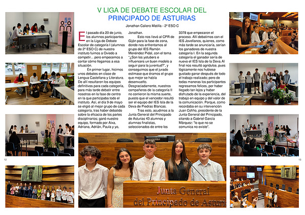 Tras esto, acudimos a la Junta General del Principado de Asturias 43 alumnos y alumnas finalistas, seleccionados de entre los 3378 que empezaron el proceso. Allí debatimos con el IES Jovellanos, quienes, como más tarde se anunciaría, serían los ganadores de nuestra categoría I. En la segunda categoría el ganador sería de nuevo el IES Isla de la Deva.Al final nos resultó agridulce, pues lógicamente nos hubiese gustado ganar después de todo el trabajo realizado; pero de todas maneras los participantes regresamos felices, por haber llegado tan lejos y haber disfrutado de la experiencia, del trabajo en equipo y del valor de la comunicación. Porque, como recordaba en su intervención Juan Cofiño, presidente de la Junta General del Principado, citando a Gabriel García Márquez: "lo que no se comunica no existe".