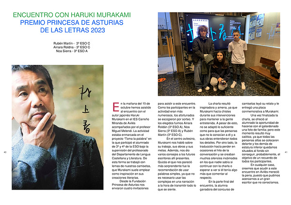 al encuentro con el autor japonés Haruki Murakami en el IES Carreño Miranda de Avilés acompañados por el profesor Miguel Melendi. La actividad estaba enmarcada en el proyecto “Toma la palabra” en la que participó el alumnado de 3º y 4º de la ESO bajo la supervisión del profesorado del Departamento de Lengua Castellana y Literatura. De esta forma se trabajó con lemas de nuestras camisetas, que Murakami suele emplear como inspiración en sus creaciones literarias.