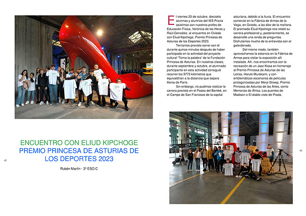 asistimos con nuestros profes de Educación Física, Verónica de las Heras y Raúl González, al encuentro en Oviedo con Eliud Kipchoge, Premio Princesa de Asturias de los Deportes 2023.