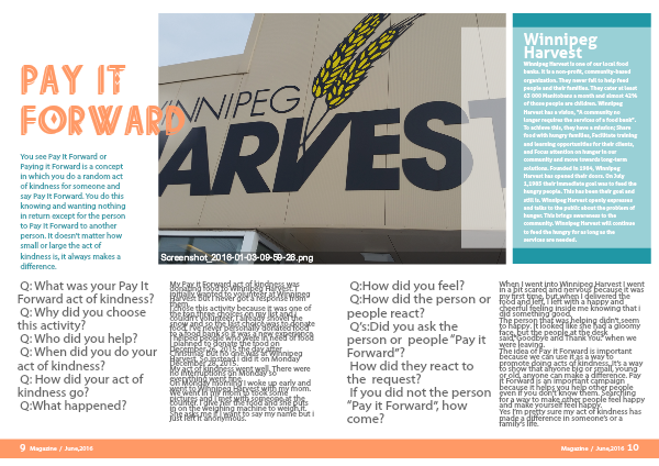 My Pay it Forward act of kindness was donating food to Winnipeg Harvest. I initially wanted to volunteer at Winnipeg Harvest but I never got a response from them.