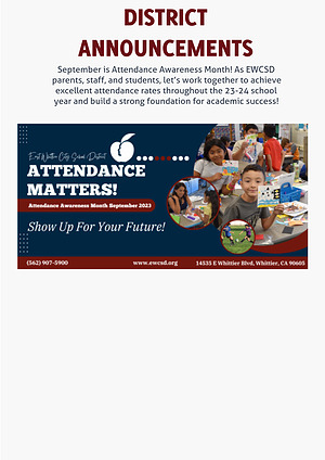 September is Attendance Awareness Month! As EWCSD parents, staff, and students, let’s work together to achieve excellent attendance rates throughout the 23-24 school year and build a strong foundation for academic success!