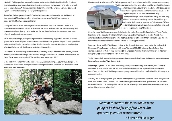 Soon after Steve and Teri Weisberger retired to the Belgrade Lakes in central Maine, he co-founded Northwest Winds Recovery in Bangor with Joyce Warren, LADC, CCS, a licensed alcohol and drug counselor. Each month, they help between 30 to 40 people from rural communitities around Bangor navigate opiod addiction and build productive lives.