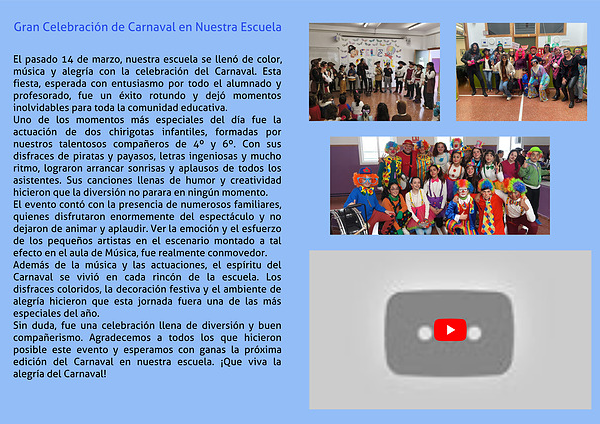 Además de la música y las actuaciones, el espíritu del Carnaval se vivió en cada rincón de la escuela. Los disfraces coloridos, la decoración festiva y el ambiente de alegría hicieron que esta jornada fuera una de las más especiales del año.