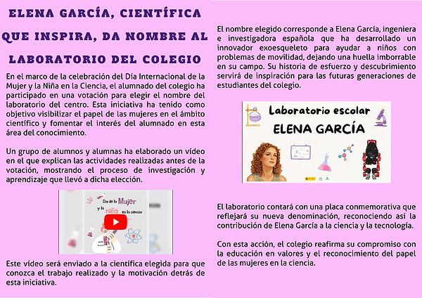 En el marco de la celebración del Día Internacional de la Mujer y la Niña en la Ciencia, el alumnado del colegio ha participado en una votación para elegir el nombre del laboratorio del centro. Esta iniciativa ha tenido como objetivo visibilizar el papel de las mujeres en el ámbito científico y fomentar el interés del alumnado en esta área del conocimiento.