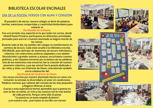 Durante todo el día, los pasillos del colegio se transformaron en caminos de lectura. Cada clase acudió a la biblioteca escolar, ENCINALEE, para disfrutar de momentos de lectura individual y colectiva, con colecciones poéticas adaptadas a sus edades.