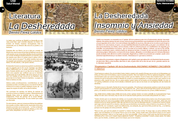 Galdós nos muestra con maestria en el Capítulo XII de la primera parte de la Desheredada, titulado Insomnio número cincuenta y tantos, las emociones, sensaciones y pensamientos que mantienen en vela toda una noche a la protagonista de la obra. Con toda la fuerza descriptiva de su prosa, ahonda en los recobecos psicologicos de Isidora. De esta manera, el autor, con una habilidad literaria incuestionable, y un gran conocimiento de las emociones humanas, nos invita, casi nos fuerza, a vivir en primera persona los sentimientos de angustia, y el torbellino de pensamientos inconexos que se suceden en su mente. Minuto a minuto, en una noche sin fin, seremos arrastrados junto a Isidora, hasta un amanacer incierto. A través de una sucesión de pinceladas de sintomas y signos hilvanados con la preción de un cirujano, dibujados con la belleza que solo la buena literatura puede alcanzar, más allá de los sobrios manuales diagnósticos, Galdós nos presenta un complejo cuadro de la ansiedad experimentada por un futuro incierto. Ansiedad por lo que nunca seremos.