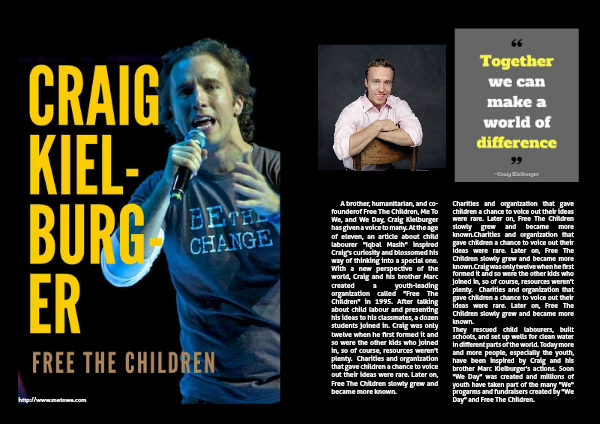 A brother, humanitarian, and co-founderof Free The Children, Me To We, and We Day, Craig Kielburger has given a voice to many. At the age of eleven, an article about child labourer "Iqbal Masih" inspired Craig's curiosity and blossomed his way of thinking into a special one. With a new perspective of the world, Craig and his brother Marc created a youth-leading organization called "Free The Children" in 1995. After talking about child labour and presenting his ideas to his classmates, a dozen students joined in. Craig was only twelve when he first formed it and so were the other kids who joined in, so of course, resources weren't plenty. Charities and organization that gave children a chance to voice out their ideas were rare. Later on, Free The Children slowly grew and became more known.