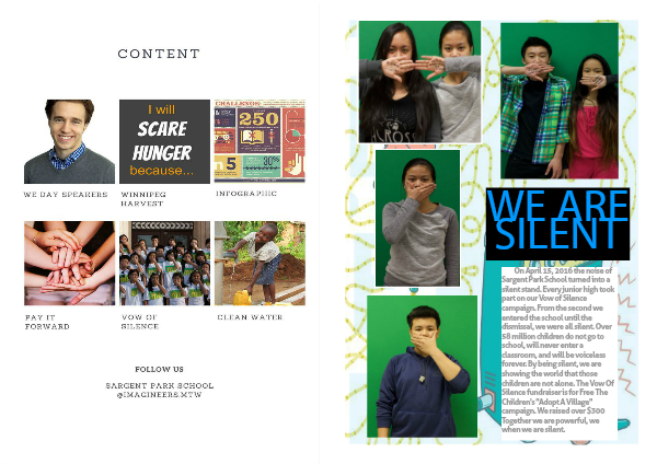On April 15, 2016 the noise of Sargent Park School turned into a silent stand. Every junior high took part on our Vow of Silence campaign. From the second we entered the school until the dismissal, we were all silent. Over 58 million children do not go to school, will never enter a classroom, and will be voiceless forever. By being silent, we are showing the world that those children are not alone. The Vow Of Silence fundraiser is for Free The Children's "Adopt A Village" campaign. We raised over $300 Together we are powerful, we when we are silent.