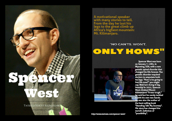Spencer West was born on January 7, 1981, in Wyoming, USA, with a rare genetic spinal disorder that changed his life forever. The genetic disorder required doctors to amputate both his legs. "How is he going to live life now?" you might say. Well he's living it big, literally! In 2012, Spencer West climbed Mount Kilimanjaro! "It was tough," he said but he surely tackled it with his own two hands. He was also the author of the best-selling book "Standing Tall: My Journey". His story has changed the world's defintion of "possibility".