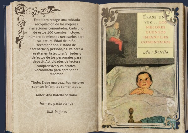 Este libro recoge una cuidada recopilación de las mejores narraciones comentadas, Cada uno de estos 100 cuentos incluye: número de minutos necesarios para su lectura. Edad del niño recomendada. Listado de escenarios y personajes. Valores a resaltar en la lectura. Virtudes y defectos de los personajes para debatir. Actividades de lectura comprensiva y valorativa. Vocabulario para aprender a recordar.