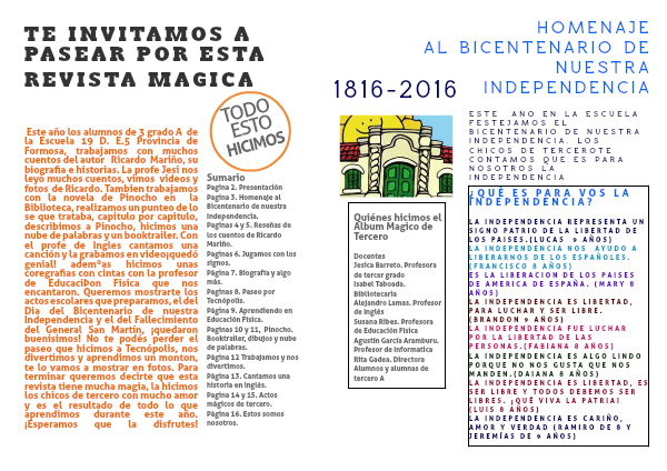 Este año los alumnos de 3 grado A de la Escuela 19 D. E.5 Provincia de Formosa, trabajamos con muchos cuentos del autor Ricardo Mariño, su biografia e historias. La profe Jesi nos leyo muchos cuentos, vimos videos y fotos de Ricardo. Tambien trabajamos con la novela de Pinocho en la Biblioteca, realizamos un punteo de lo se que trataba, capitulo por capitulo, describimos a Pinocho, hicimos una nube de palabras y un booktrailer. Con el profe de Ingles cantamos una canción y la grabamos en video¡quedó genial! ademºas hicimos unas coregrafias con cintas con la profesor de EducaciÞon Fisica que nos encantaron. Queremos mostrarte los actos escolares que preparamos, el del Dia del Bicentenario de nuestra Independencia y el del Fallecimiento del General San Martín, ¡quedaron buenisimos! No te podés perder el paseo que hicimos a Tecnópolis, nos divertimos y aprendimos un monton, te lo vamos a mostrar en fotos. Para terminar queremos decirte que esta revista tiene mucha magia, la hicimos los chicos de tercero con mucho amor y es el resultado de todo lo que aprendimos durante este año. ¡Esperamos que la disfrutes!
