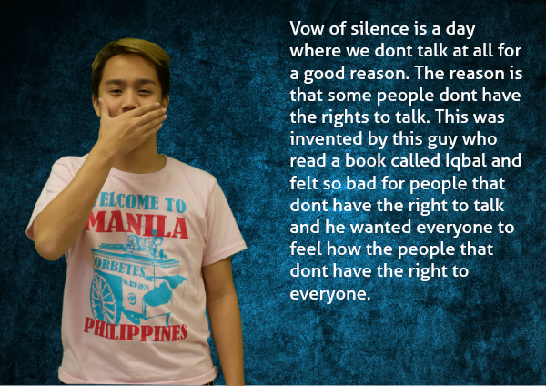 Vow of silence is a day where we dont talk at all for a good reason. The reason is that some people dont have the rights to talk. This was invented by this guy who read a book called Iqbal and felt so bad for people that dont have the right to talk and he wanted everyone to feel how the people that dont have the right to everyone.