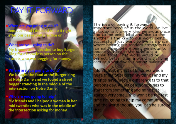 The idea of paying it forward is important because in the world we live in today isn’t a very kind generous place and to me being kind and nice to one another is the key to our world being successful. I just want to live in a place where helping out random strangers is a normal thing, where being generous to people you see in the streets is a normal thing. That world would be perfect, better than a world with flying cars or a world with floating buildings.