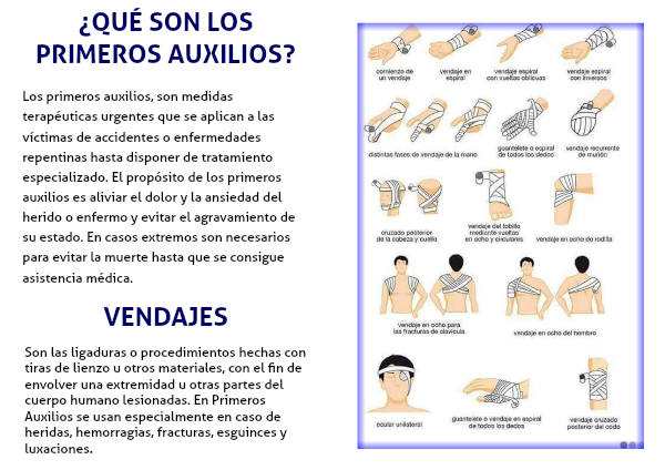 Los primeros auxilios, son medidas terapéuticas urgentes que se aplican a las víctimas de accidentes o enfermedades repentinas hasta disponer de tratamiento especializado. El propósito de los primeros auxilios es aliviar el dolor y la ansiedad del herido o enfermo y evitar el agravamiento de su estado. En casos extremos son necesarios para evitar la muerte hasta que se consigue asistencia médica.