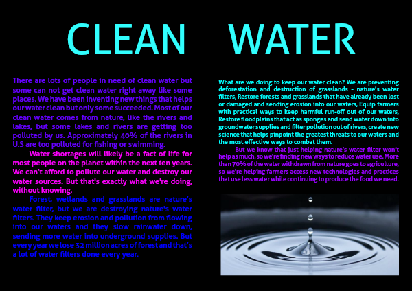 What are we doing to keep our water clean? We are preventing deforestation and destruction of grasslands - nature’s water filters, Restore forests and grasslands that have already been lost or damaged and sending erosion into our waters, Equip farmers with practical ways to keep harmful run-off out of our waters, Restore floodplains that act as sponges and send water down into groundwater supplies and filter pollution out of rivers, create new science that helps pinpoint the greatest threats to our waters and the most effective ways to combat them.