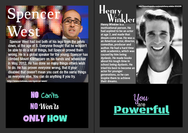Spencer West had lost both of his legs from the pelvis down, at the age of 5. Everyone thought that he wouldn’t be able to do a lot of things, but Spencer proved them wrong. He is a global speaker for the young. Spencer has climbed Mount Kilimanjaro on his hands and wheelchair in May, 2012. He has done so many things others wish to do. He has proven everyone wrong, that if your disabled that doesn't mean you cant do the same things as everyone else. You can do anything if you try.