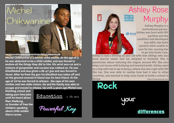 Michel Chikwanine is a former child soldier. At the age of 5 he was abducted to be a child soldier, and was forced to endure all the things they did to him. His wrist was cut and a mixture of gunpowder and cocaine was rubbed on. He was blindfolded and was given a Ak-47 gun and was forced to shoot. After he fired the gun his blindfold was taken off and on the ground covered in blood was his best friend. At the age of 10 he was forced to witness . the rape of his own mother and two older sisters. He and his family was able to escape and moved to ottawa. Up until 4 years ago Michel was finishing school and