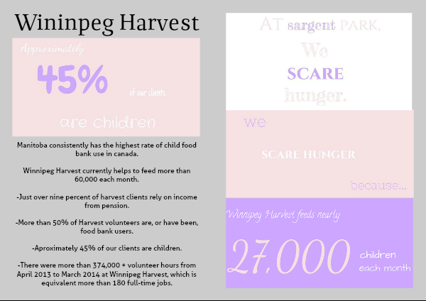 -There were more than 374,000 + volunteer hours from April 2013 to March 2014 at Winnipeg Harvest, which is equivalent more than 180 full-time jobs.