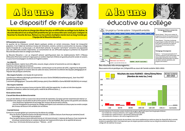 La Réussite Éducative » est un dispositif présent spécifiquement dans les établissements R.E.P.+ (“Réseau d’Éducation Prioritaire renforcé”) regroupant un nombre important d’élèves en grande précarité sociale et scolaire. Il a pour but d’accompagner ces élèves en fragilité scolaire.