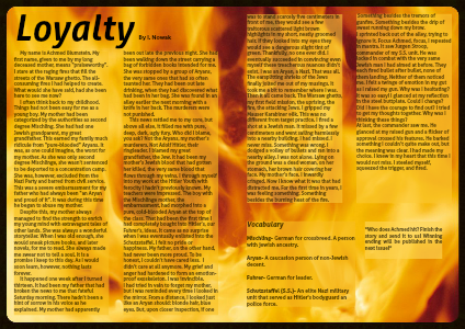 been out late the previous night. She had been walking down the street carrying a bag of forbidden books intended for me. She was stopped by a group of Aryans, the very same ones that had so often taunted her. They had been out late drinking, when they had discovered what had been in her bag. She was found in an alley earlier the next morning with a knife in her back. The murderers were not punished.