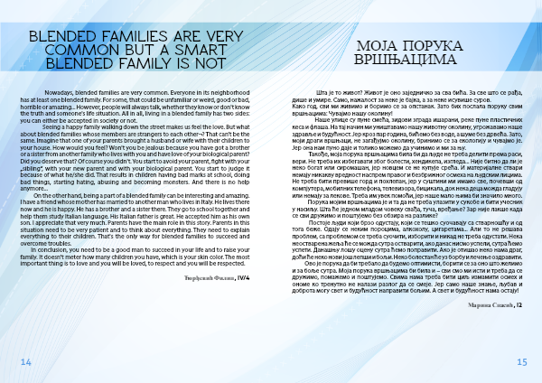 Такође, моја порука вршњацима била би да људе не треба делити према раси, вери. Не треба их избегавати због болести, хендикепа, изгледа... Није битно да ли је неко богат или сиромашан, јер новцем се не купује срећа. И материјалне ствари немају никакву вредност наспрем правог и безбрижног осмеха на људским лицима. Не треба бити превише горд и похлепан, јер у суштини ми имамо све, почевши од компјутера, мобилних телефона, телевизора, бицикала, док нека деца можда гладују или немају за лекове. Треба им увек помоћи, јер наше мало њима би значило много.