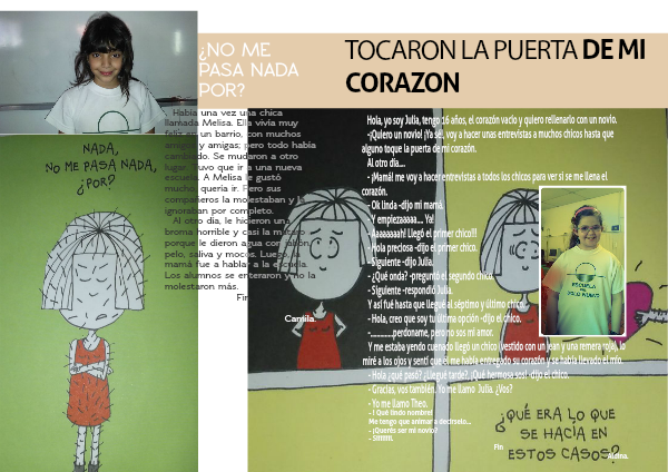 Y me estaba yendo cuenado llegó un chico (vestido con un jean y una remera roja), lo miré a los ojos y sentí que él me había entregado su corazón y se había llevado el mío.