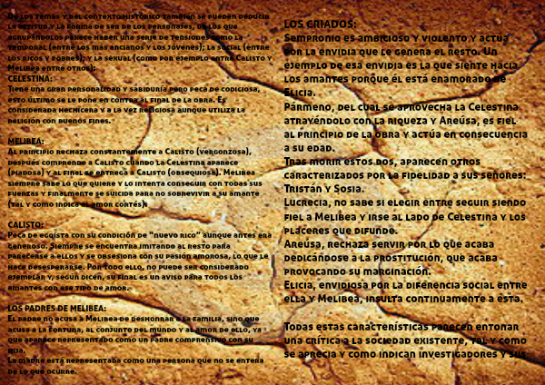 De los temas y del contexto histórico también se pueden deducir la actitud y la forma de ser de los personajes, de los que agrupándolos parece haber una serie de tensiones como la temporal (entre los más ancianos y los jóvenes); la social (entre los ricos y pobres); y la sexual (como por ejemplo entre Calisto y Melibea entre otros):
