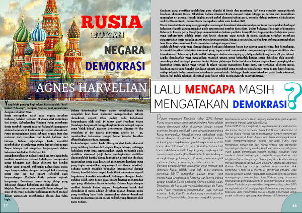Dalam wawancara Republika tahun 2012 dengan Putin, secara tegas Ia mengatakan bahwa Rusia adalah negara demokrasi bukan dijalankan dengan sistem otoriter. Secara subjektif saya berpandangan bahwa Rusia membungkus kebijakan yang terkadang tidak bebas dengan demokrasi. Tanpa dipungkiri bahwa selesainya perang dunia menyisahkan garis antara blok barat dan blok timur, dimana dikatakan bahwa blok barat adalah mereka (kelompok) yang menghargai hak asasi manusia sedangkan Rusia eks. Komunis dengan serangkaian penyelewengan hak asasi manusia menjadi pantauan dalam perkembangan modern saat ini.