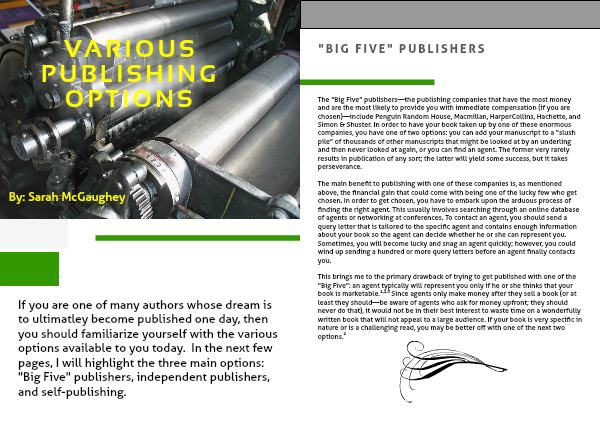 If you are one of many authors whose dream is to ultimatley become published one day, then you should familiarize yourself with the various options available to you today. In the next few pages, I will highlight the three main options: "Big Five" publishers, independent publishers, and self-publishing.