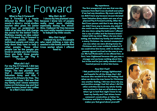 For my Pay It Forward, I did two planned and two unexpected things. The two planned was that I donated clothing at Salvation Army and that I babysat for 8 hours for free. The unexpected ones I did was that my family and I drove someone home on Christmas day and that I gave banana bread and coffee to a Red Cross worker.