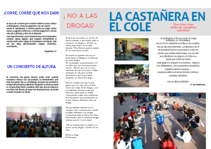El día 6 de noviembre, los de 5º y 6º hemos asistido a una charla sobre el consumo de drogas y alcohol. La charla está dentro de un plan llamado “Plan Director para la mejora de la convivencia escolar”.