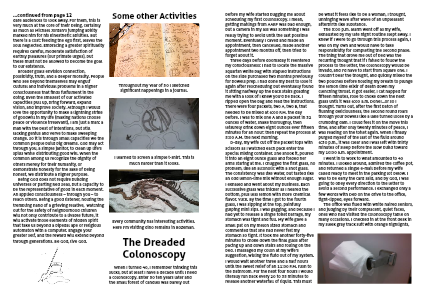 D-day, my wife cut off the packet tops with scissors as I watched each pack enter the special mixing container. She shook it, poured it into an eight ounce glass and folded her arms staring at me. I chugged the first glass, no problem, like an alcoholic with a shot glass. The consistency was like water, but tasted like an odd lemon-lime mix without enough sugar. I exhaled and went about my business. Each successive glass was thicker as I neared the bottom, plus less lemon with more chemical flavor. Yuck. By the time I got to the fourth glass, I was sipping at the top, painfully gulping mini sips. I was gagging, and because I had yet to release a single toilet barrage, my stomach was tight and full. My wife gave a small pat on my melon sized stomach and commented that she had never felt my stomach so tight. It took me another forty-five minutes to choke down the final glass after pacing up and down stairs and rolling on the bed. I massaged my colon at my wife’s suggestion, willing the fluid out of my system. I would wait another three and a half hours until the sweet relief of an 11:00 P.M. rush to the bathroom. For the next four hours I would literally run back every 20 to 35 minutes to release another waterfall of liquid. This must be what it feels like to be a woman, I thought, unhinging wave after wave of an unpleasant afterbirth like substance.