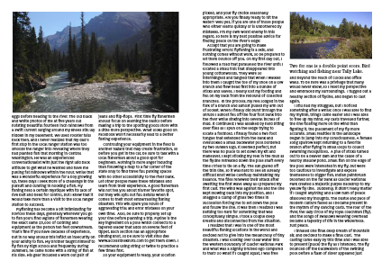 eggs before heading to the river. The old black and white photos of me at five years old hoisting beautiful fourteen inch rainbows from a swift current surging around my knees still lay hidden in my basement. We used rooster tails back then, and I never realized that my dad’s first stop in the local ranger station was too smooze the ranger into revealing where they had planted fish that morning in Central Washington. He was an experienced conversationalist with just the right laid back attitude to get what he wanted and have me pulling fat rainbows within the hour. While that was a wonderful experience for a boy growing up, these days I seek more of a challenge in the pursuit and cunning in hooking a fish. Fly fishing held a certain mystique with its lack of live bait and need for control, but I knew that it would take more than a visit to the local ranger station to succeed.