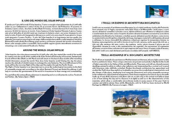 The flight of Solar Impulse is an important test to prove the technological innovation in the field of renewable energy and, according to the pilots Bertrand Piccard and André Borschberg, it will help to convince the governments of the world to investmore in clean energy and sustainability. You can follow this extraordinary adventure in streaming and on social networks such as Facebook and Twitter. (By Tatiana Gjeci – ITALY)