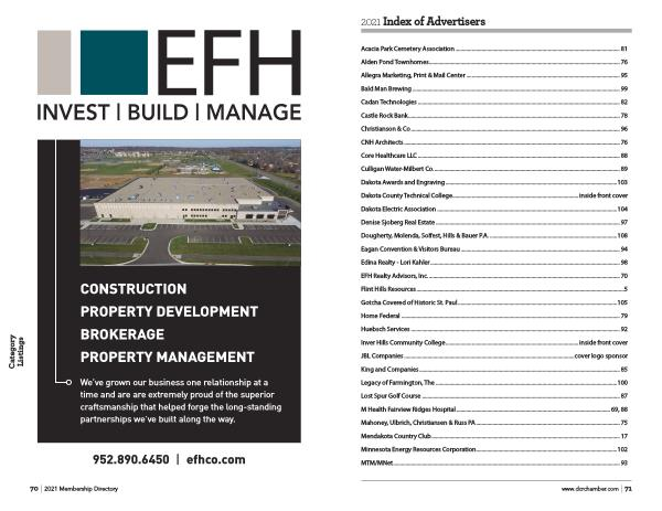 Acacia Park Cemetery Association ........................................................................................................................ 81 Alden Pond Townhomes ........................................................................................................................................... 76 Allegra Marketing , Print & Mail Center ................................................................................................................ 95 Bald Man Brewing ....................................................................................................................................................... 99 Cadan Technologies ................................................................................................................................................... 82 Castle Rock Bank .......................................................................................................................................................... 78 Christianson & Co ........................................................................................................................................................ 96 CNH Architects ............................................................................................................................................................. 76 Core Healthcare LLC ................................................................................................................................................... 88 Culligan Water-Milbert Co ........................................................................................................................................ 89 Dakota Awards and Engraving ............................................................................................................................. 103 Dakota County Technical College ............................................................................................ inside front cover Dakota Electric Association ................................................................................................................................... 104 Denise Sjoberg Real Estate ...................................................................................................................................... 97 Dougherty , Molenda , Solfest , Hills & Bauer P . A .............................................................................................. 108 Eagan Convention & Visitors Bureau .................................................................................................................... 94 Edina Realty - Lori Kahler .......................................................................................................................................... 98 EFH Realty Advisors , Inc ............................................................................................................................................ 70 Flint Hills Resources ....................................................................................................................................................... 5 Gotcha Covered of Historic St . Paul .................................................................................................................... 105 Home Federal ............................................................................................................................................................... 79 Huebsch Services ........................................................................................................................................................ 92 Inver Hills Community College ................................................................................................. inside front cover JBL Companies ............................................................................................................................ cover logo sponsor King and Companies .................................................................................................................................................. 85 Legacy of Farmington , The .................................................................................................................................... 100 Lost Spur Golf Course ................................................................................................................................................ 87 M Health Fairview Ridges Hospital ................................................................................................................ 69 , 88 Mahoney , Ulbrich , Christiansen & Russ PA ......................................................................................................... 75 Mendakota Country Club ......................................................................................................................................... 17 Minnesota Energy Resources Corporation ...................................................................................................... 102 MTM / MNet ..................................................................................................................................................................... 93
