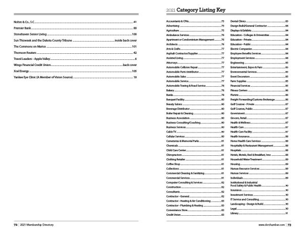 Accountants & CPAs .......................................................... 75 Advertising ........................................................................... 75 Agriculture ............................................................................ 75 Ambulance Services .......................................................... 76 Apartment or Condominium Management ............. 76 Architects .............................................................................. 76 Arts & Crafts .......................................................................... 77 Asphalt Contractor / Supplier .......................................... 77 Assisted Living ..................................................................... 77 Attorneys ............................................................................... 77 Automobile Collision Repair ........................................... 77 Automobile Parts Distributor ......................................... 77 Automobile Sales ............................................................... 77 Automobile Service ........................................................... 77 Automobile Towing & Road Service ............................ 78 Bakery ..................................................................................... 78 Banks ....................................................................................... 78 Banquet Facility .................................................................. 80 Beauty Salons ...................................................................... 80 Beverage Distributor ......................................................... 80 Boiler Repair & Cleaning .................................................. 80 Business Association ......................................................... 80 Business Consulting / Coaching ...................................... 80 Business Services ................................................................ 80 Cable TV ................................................................................. 80 Cellular Services .................................................................. 80 Cemeteries & Memorial Parks ........................................ 81 Chemicals .............................................................................. 81 Child Care Center ................................................................ 81 Chiropractors ....................................................................... 81 Clothing Retailer ................................................................. 81 Coffee Shop .......................................................................... 81 Collections ............................................................................ 81 Commercial Cleaning & Sanitizing ............................... 81 Commercial Services ......................................................... 81 Computer Consulting & Services .................................. 82 Construction ........................................................................ 82 Consultants ........................................................................... 82 Contractor - General .......................................................... 82 Contractor - Heating & Air Conditioning ................... 83 Contractor - Plumbing & Heating ................................. 83 Convenience Store ............................................................. 83 Credit Union ......................................................................... 83