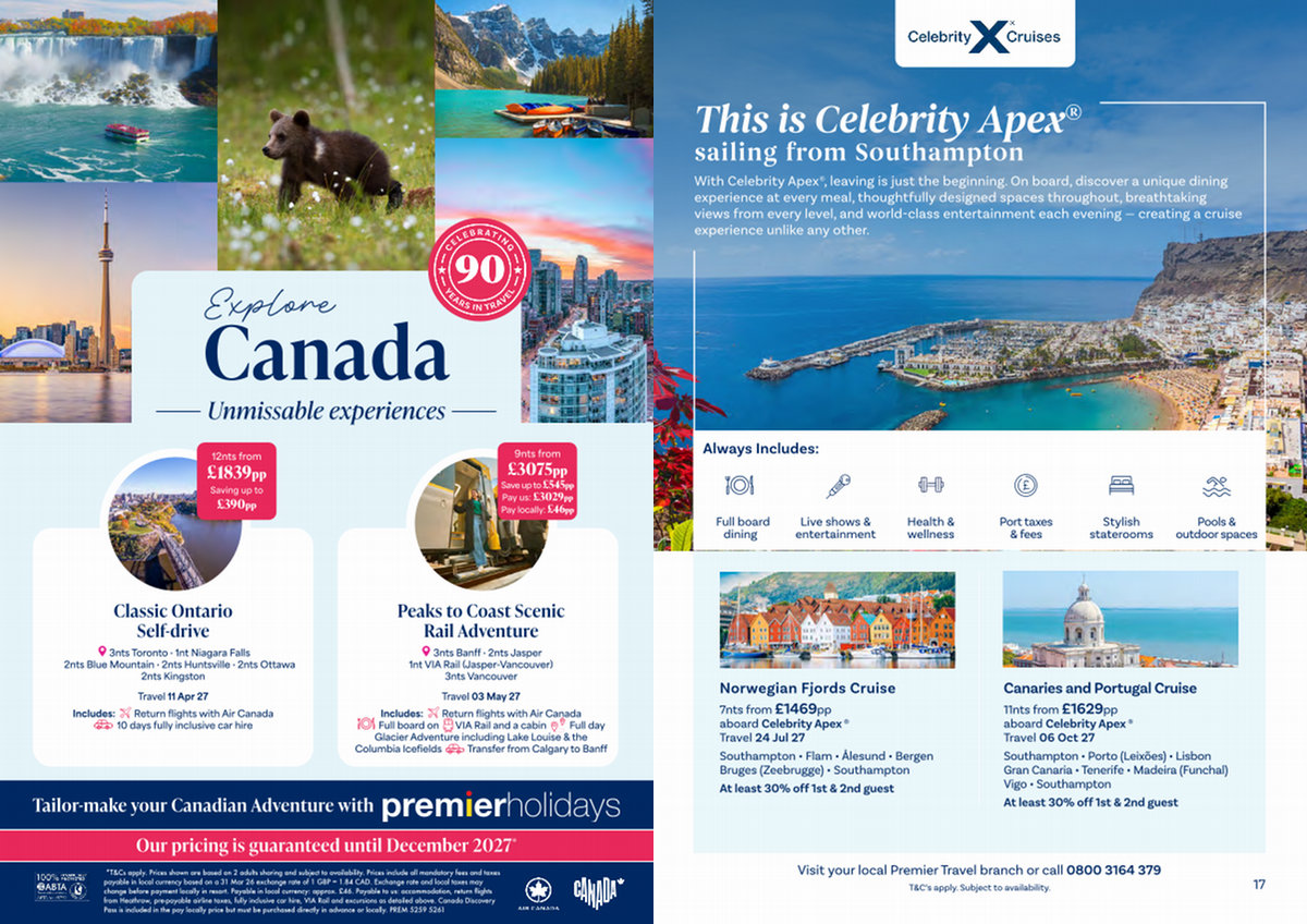 * T & Cs apply. Prices shown are based on 2 adults sharing and subject to availability. Prices include all mandatory fees and taxes payable in local currency based on a 31 Mar 26 exchange rate of 1 GBP = 1.84 CAD. Exchange rate and local taxes may change before payment locally in resort. Payable in local currency: approx. £ 46. Payable to us: accommodation, return flights from Heathrow, pre-payable airline taxes, fully inclusive car hire, VIA Rail and excursions as detailed above. Canada Discovery Pass is included in the pay locally price but must be purchased directly in advance or locally. PREM 5259 5261