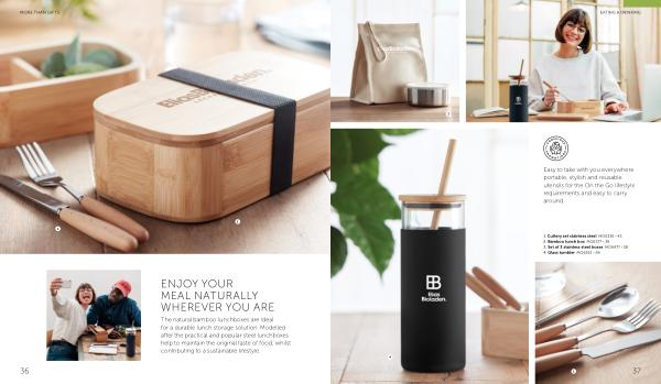 1 . Cutlery set stainless steel MO6336 › 43 2 . Bamboo lunch box MO6377 › 39 3 . Set of 3 stainless steel boxes MO6477 › 38 4 . Glass tumbler MO6352 › 44