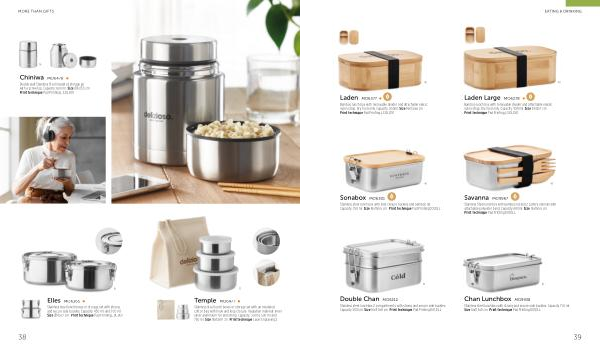 Stainless Steel lunchbox with bamboo lid and 2 cutlery utensils with attachable polyester band . Capacity 600ml . Size 16x11x5,5 cm Print technique Pad Printing , DO1 , DL , L