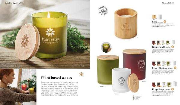 Fragranced plant based wax candle in frosted glass jar holder with bamboo lid . 280 gr . Burn time : 46 hours . Presented in a paper tube gift box . Size Ø9x10,5 cm Print technique Round screen printing , L , P