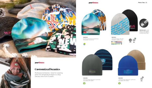 Multiseasonal beanies . Great for wearing when the temperature begins to drop . Delivery time from 6 weeks .