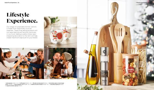 1 . Santa glasses CX1501 › 35 | 2 . Cuff beanie MW1002 › 23 | 3 . Wooden serving board MO6311 | 4 . Borosilicate glass oil and vinegar bottle MO6388 | 5 . Salt and pepper mill MO6598 › 29 | 6 . Bamboo kitchen utensils MO6597 › 28 | 7 . Borosilicate glass jar MO6271 8 . Large borosilicate glass jar MO6270